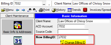 In Client Maintenance-Basic Info & Addresses, enter new BillingID number in New BillingID and click Change BillingID: