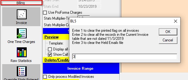 2. To clear all emails, double-click on the Billing section and select option #3 and OK: