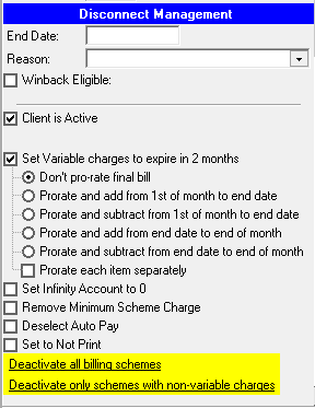 In Client Maintenance-Dates, select the disconnect Reason (setup in System-Disconnect Reasons), select Prorate option and any other of the options. Click on Deactivate all billing schemes. This will deactivate the client and all schemes for the client.