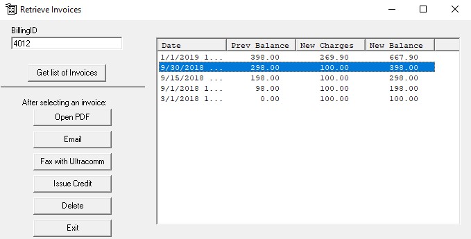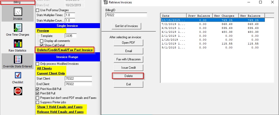 1. Select Billing – Delete/Credit/Email/Fax Past Invoice. Highlight the invoice (should be the last invoice archived) and click delete: