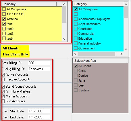 2. Select Active and/or Inactive Clients. Client Start Date is the actual start date of clients in Client Maintenance – Dates. To include all clients, use 1/1/1950. Client End Date is teh actual disconnect date of clients. To include all clients, use 1/1/2099.If running the Audit Report, the Start and End date should be the actual Invoice Date.