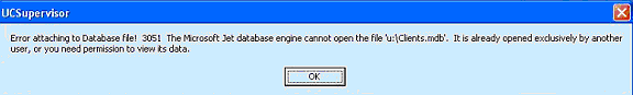On the Operator station, when trying to open UltraComm Supervisor getting an error: "Error attaching to Database file! The Micorsoft Jet database engine cannont open the file ‘u:Clients.mdb'. It is already opened exclusively by another user, our you need permission to view its data."